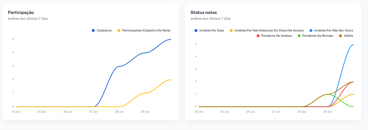 Também temos alguns gráficos muito interessantes de participação da campanha, então conseguimos acompanhar o quanto está quente a campanha em si e os status das notas que estão sendo trabalhadas.