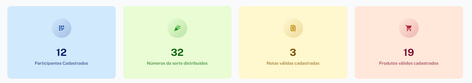 O próprio nome já diz, será onde vamos colher as métricas básicas da campanha como por exemplo: Participantes cadastrados, números da sorte distribuídos, Notas válidas cadastradas e produtos válidos cadastrados.