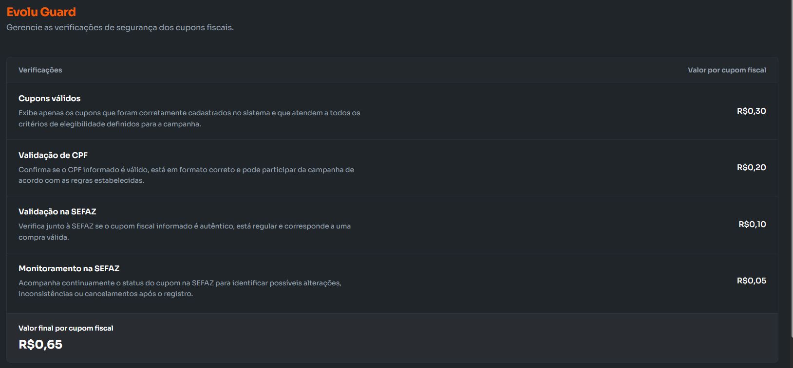 No painel do Evolu Guard visualizamos a camada de segurança da sua campanha, todos os steps que cada participação é submetido